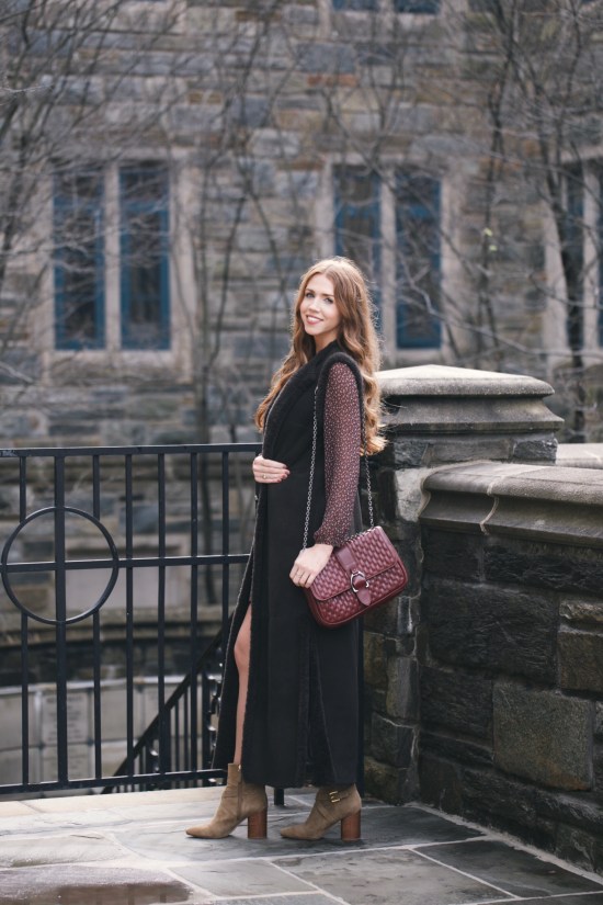 Molly in Longchamp Ready-to-Wear Sleeveless Coat and Amazone handbag in burgundy